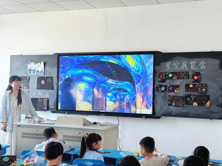 徐老师展示名家作品(如宋代瓷器建窑油滴盏、明代龙附寺星空藻井和梵高的罗纳河上的星夜),引导学生发现“点”的多样性与排列规律。 现场演示“点的组合”,在刮画纸上创作疏密、大小不同的点阵,并启发学生思考“点的情绪”(如密集点表现热闹,分散点表现宁静)。 徐老师巧妙运用“微课”视频示范特殊技法,解决低年级学生操作难点;游戏环节既巩固知识,又培养团队协作能力。 学生以“星空”为主题自由创作。徐老师巡回指导时,注重分层教学;作品展示环节,学生踊跃解说创意,童趣盎然。 评价环节中,“自评、生评和师评”的评价方式也提升了学生的交流表达能力。最后,她延伸综合材料的使用,并介绍了多种材料的创作方法,鼓励学生做“美的发现者和创造者”。